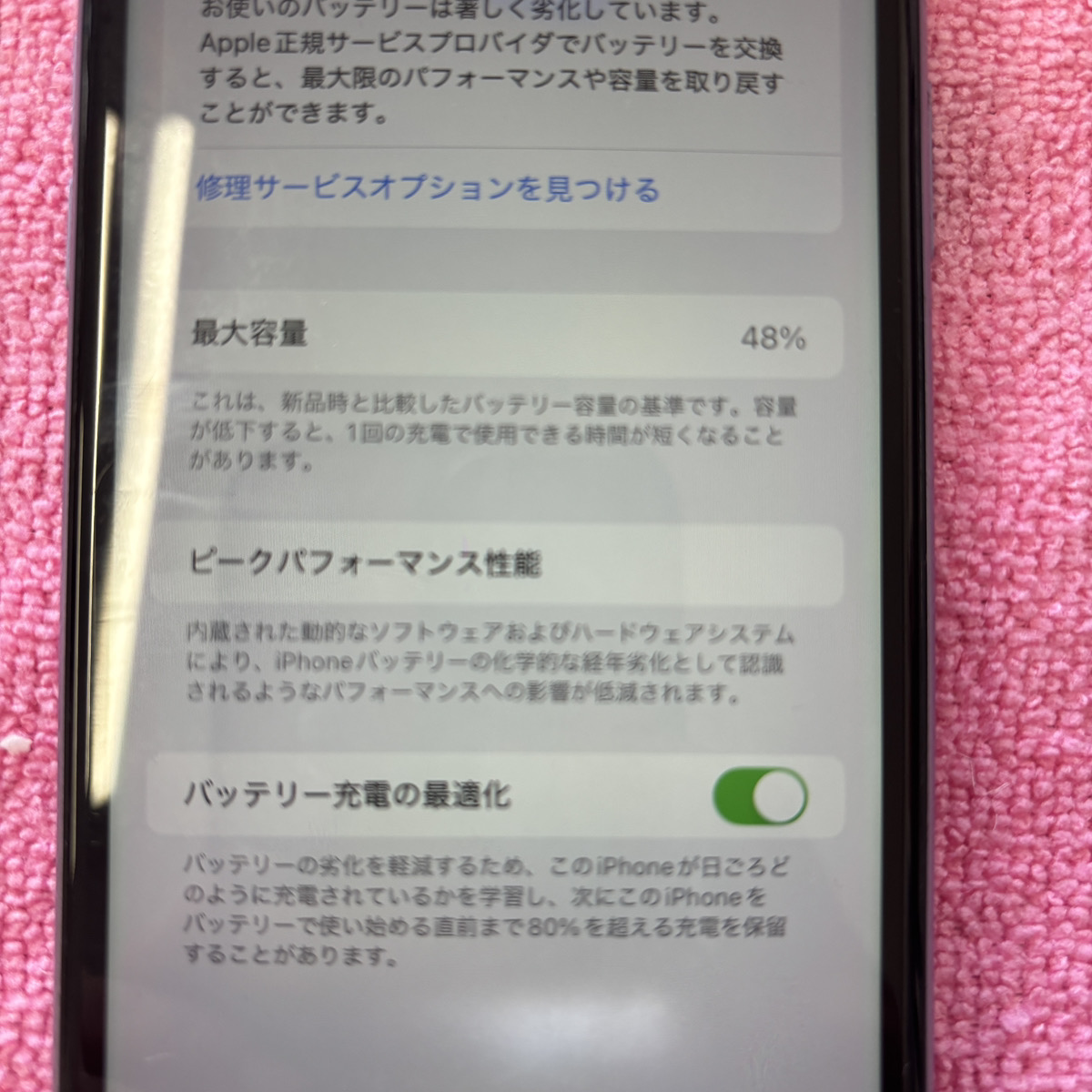 設定からバッテリーの最大容量を確認したところ、48%まで下がっている状態です。